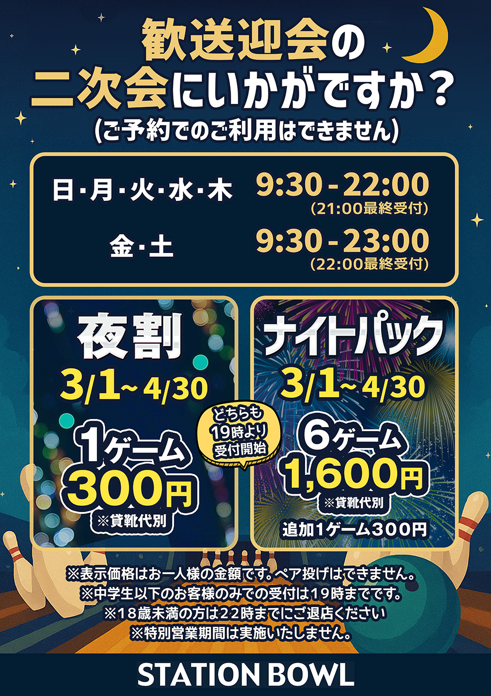 夜割!ナイトパック!超お得! 2025年07月25日 前の記事 イベント一覧へ 次の記事 最新のお知らせ 2026.03.28 4月の予定表と混雑状況について 2026.02.26 3月の予定表と混雑状況について 2026.02.06 ハウスコンディション(1/14~) 2026.01.01 価格改定のお知らせ 2025.07.25 営業時間延長のお知らせ【8/1(金)~】