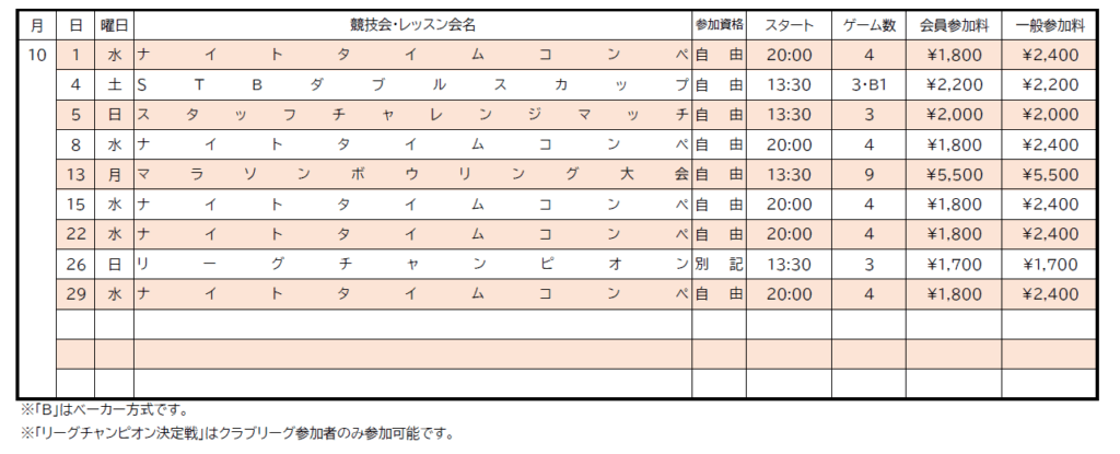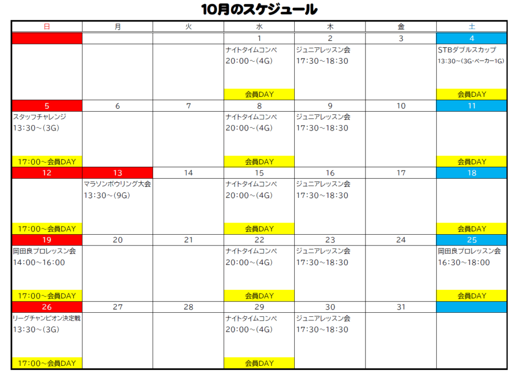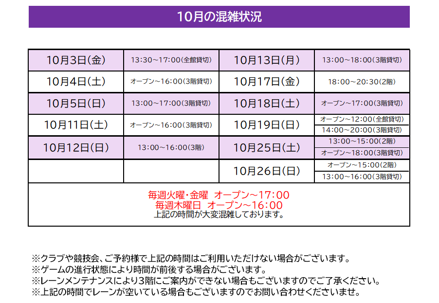 10月の予定表と混雑状況について